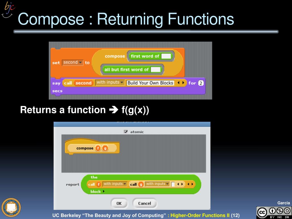 Today • Review useful HOFs • map Reporter over List • Report a new list, every element E of Listbecoming Reporter(E) • keep items such that Predicate from List • Report a new list, keeping only elements Eof List if Predicate(E) • combine with Reporter over List • Combine all the elements of List with Reporter(E) • This is also known as “reduce” • Acronym example • keep map combine • The script, run and launch • For each • Compose example