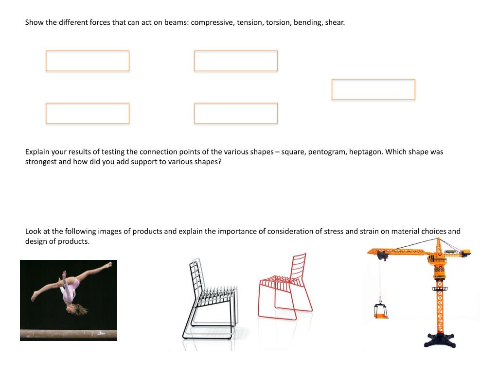 Show the different forces that can act on beams: compressive, tension, torsion, bending, shear. Explain your results of testing the connection points of the various shapes – square, pentogram, heptagon. Which shape was strongest and how did you add support to various shapes? Look at the following images of products and explain the importance of consideration of stress and strain on material choices and design of products.