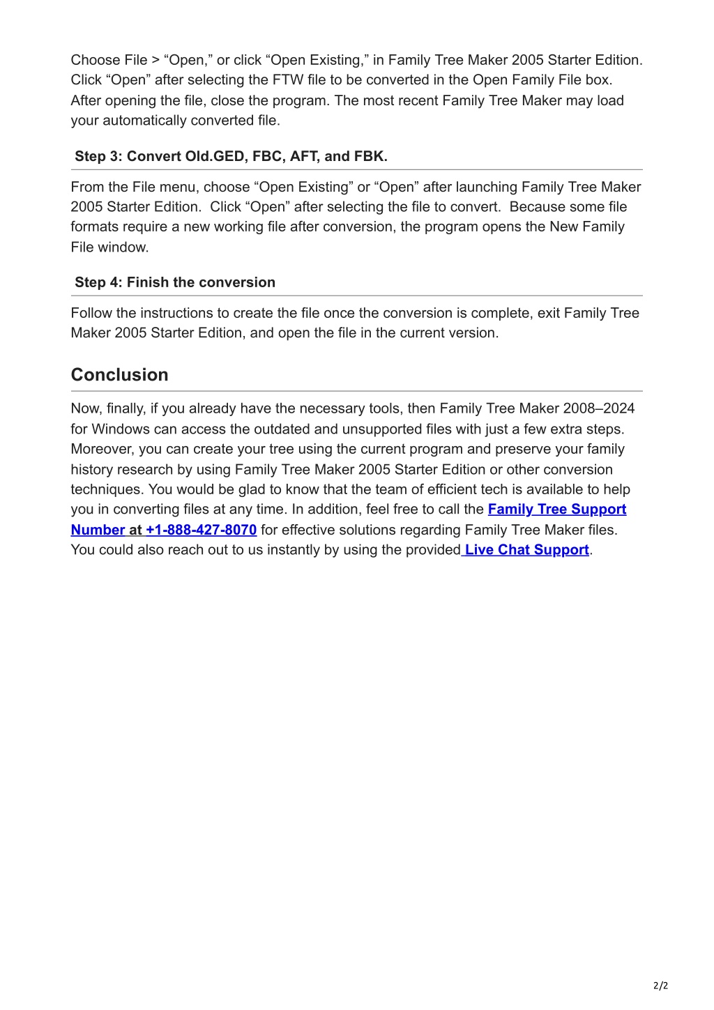 Choose File > “Open,” or click “Open Existing,” in Family Tree Maker 2005 Starter Edition. Click “Open” after selecting the FTW file to be converted in the Open Family File box. After opening the file, close the program. The most recent Family Tree Maker may load your automatically converted file. Step 3: Convert Old.GED, FBC, AFT, and FBK. From the File menu, choose “Open Existing” or “Open” after launching Family Tree Maker 2005 Starter Edition. Click “Open” after selecting the file to convert. Because some file formats require a new working file after conversion, the program opens the New Family File window. Step 4: Finish the conversion Follow the instructions to create the file once the conversion is complete, exit Family Tree Maker 2005 Starter Edition, and open the file in the current version. Conclusion Now, finally, if you already have the necessary tools, then Family Tree Maker 2008–2024 for Windows can access the outdated and unsupported files with just a few extra steps. Moreover, you can create your tree using the current program and preserve your family history research by using Family Tree Maker 2005 Starter Edition or other conversion techniques. You would be glad to know that the team of efficient tech is available to help you in converting files at any time. In addition, feel free to call the Family Tree Support Number at +1-888-427-8070 for effective solutions regarding Family Tree Maker files. You could also reach out to us instantly by using the provided Live Chat Support. 2/2