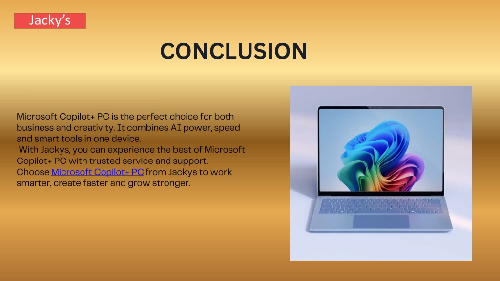 CONCLUSION Microsoft Copilot+ PC is the perfect choice for both business and creativity. It combines AI power, speed and smart tools in one device. With Jackys, you can experience the best of Microsoft Copilot+ PC with trusted service and support. Choose Microsoft Copilot+ PC from Jackys to work smarter, create faster and grow stronger.