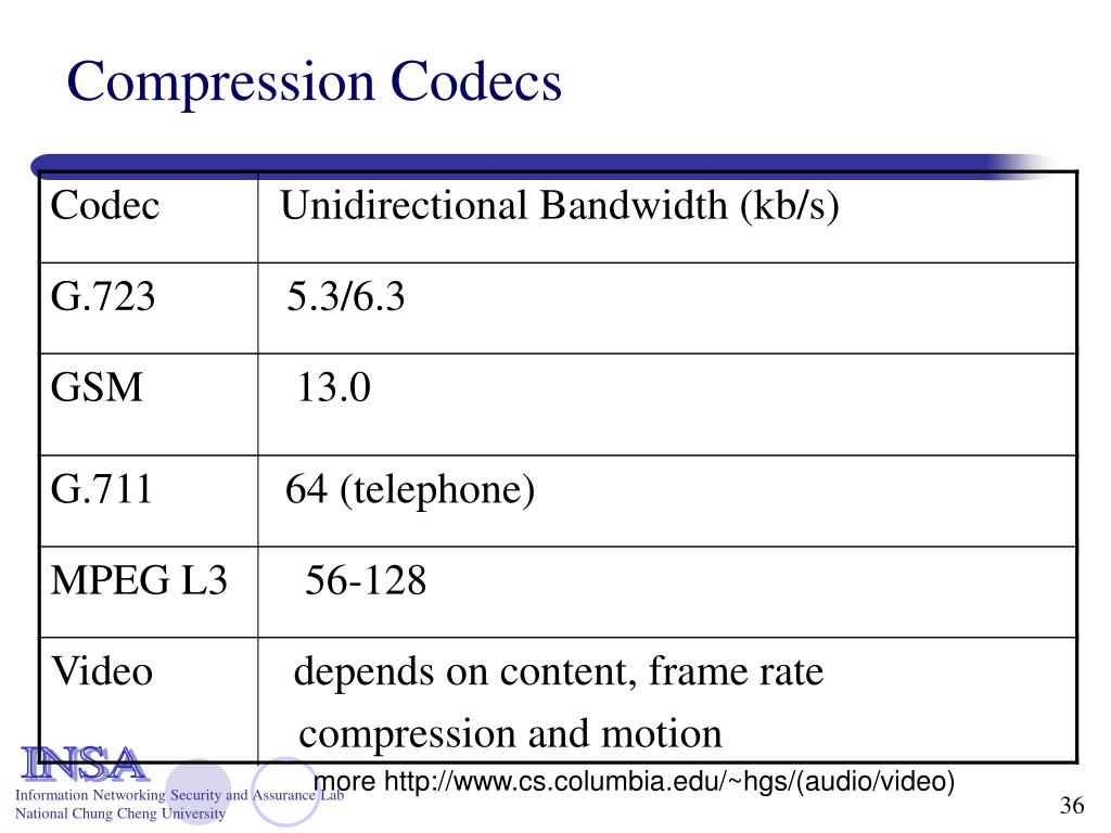 Compression Codecs more http://www.cs.columbia.edu/~hgs/(audio/video)
