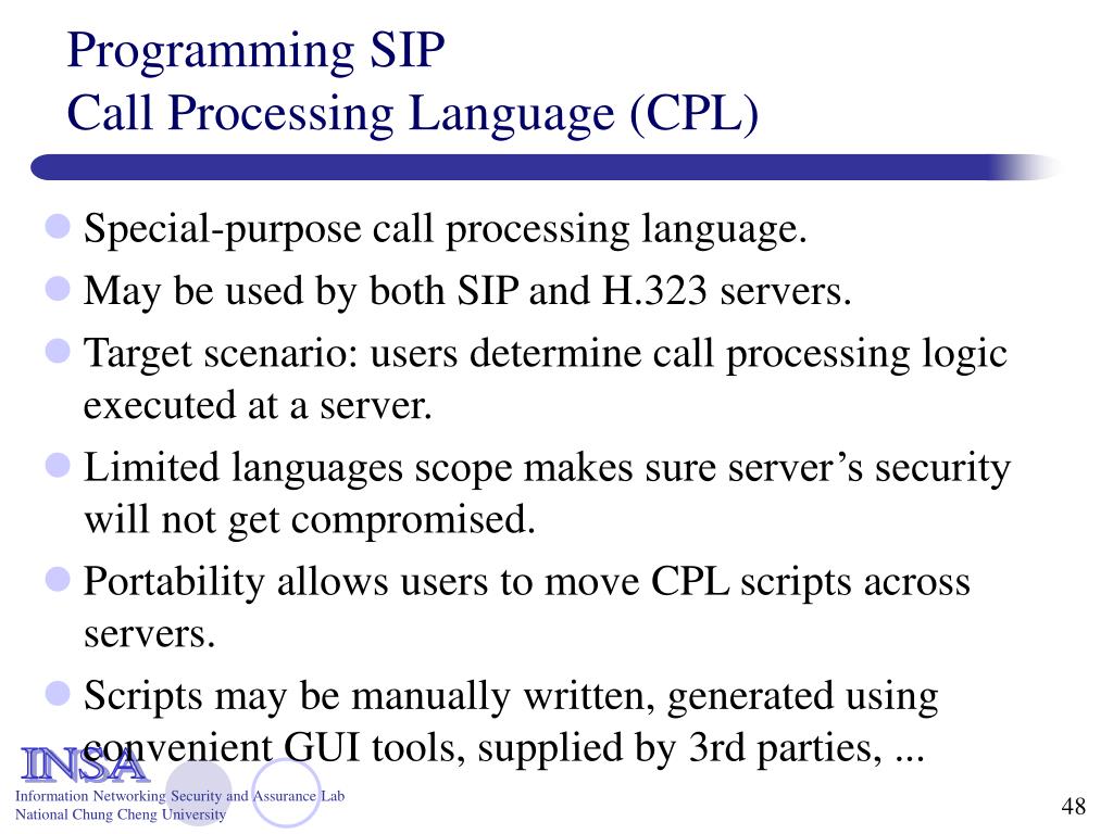 Programming SIP Call Processing Language (CPL) • Special-purpose call processing language. • May be used by both SIP and H.323 servers. • Target scenario: users determine call processing logic executed at a server. • Limited languages scope makes sure server’s security will not get compromised. • Portability allows users to move CPL scripts across servers. • Scripts may be manually written, generated using convenient GUI tools, supplied by 3rd parties, ...