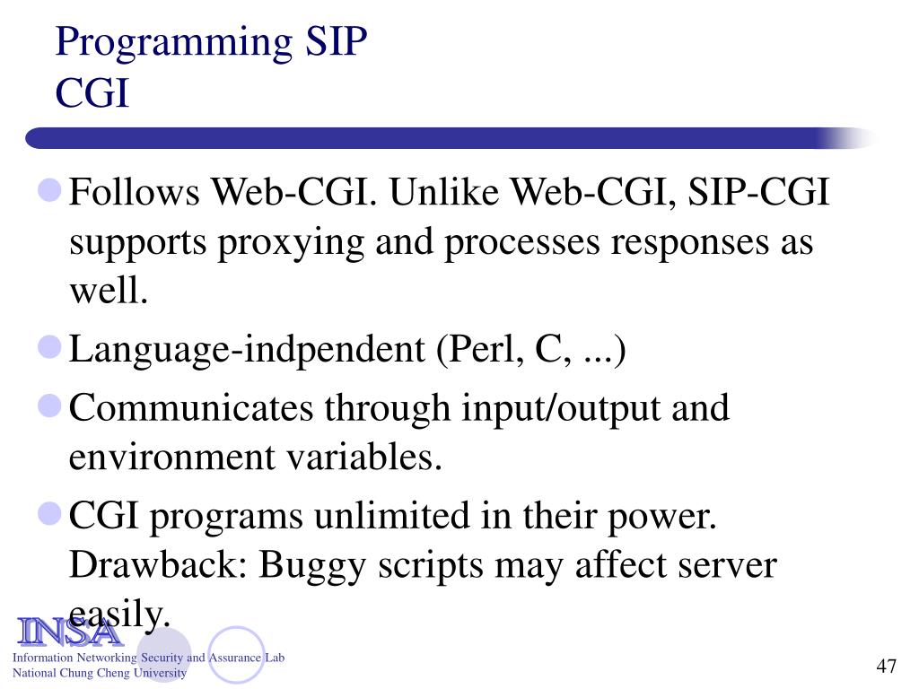 Programming SIP CGI • Follows Web-CGI. Unlike Web-CGI, SIP-CGI supports proxying and processes responses as well. • Language-indpendent (Perl, C, ...) • Communicates through input/output and environment variables. • CGI programs unlimited in their power. Drawback: Buggy scripts may affect server easily.