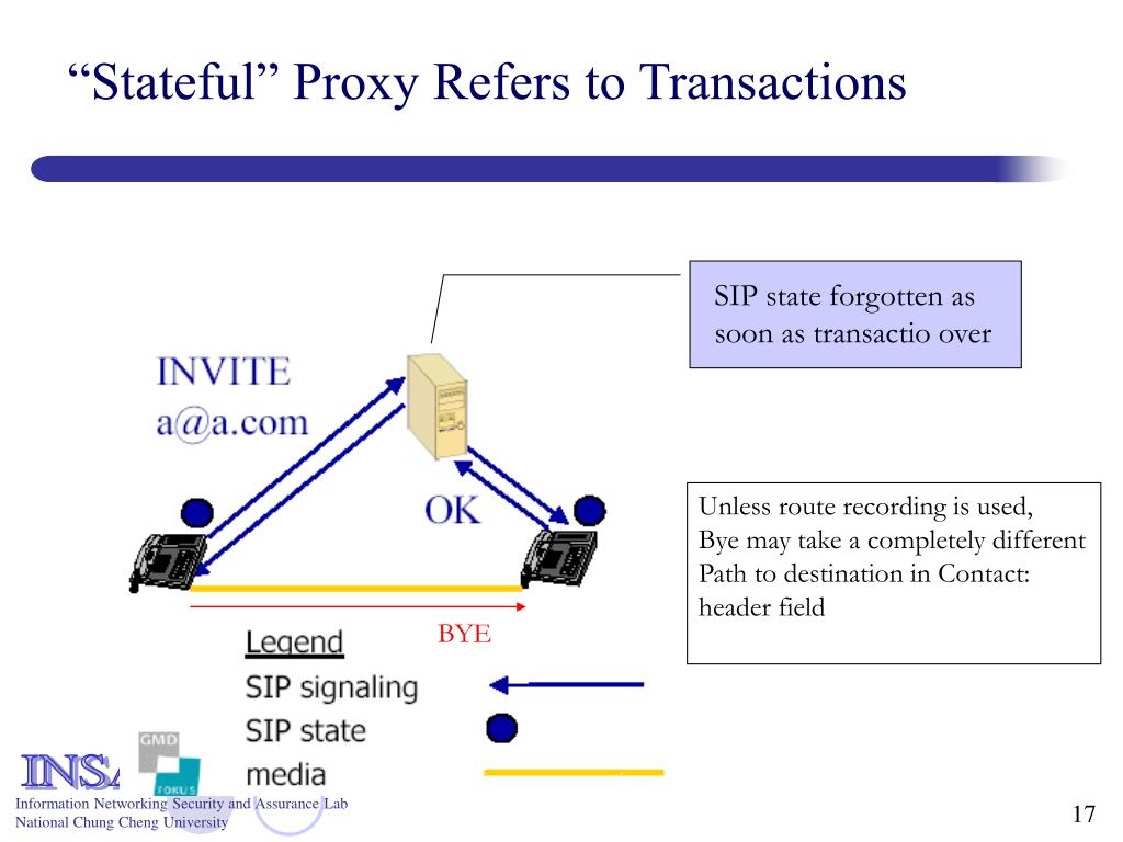 “Stateful” Proxy Refers to Transactions SIP state forgotten as soon as transactio over Unless route recording is used, Bye may take a completely different Path to destination in Contact: header field BYE