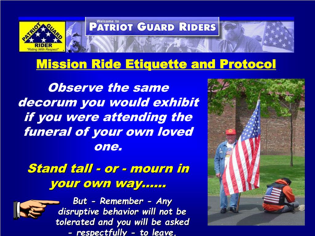 Mission Ride Etiquette and Protocol Observe the same decorum you would exhibit if you were attending the funeral of your own loved one. Stand tall - or - mourn in your own way…... But - Remember - Any disruptive behavior will not be tolerated and you will be asked - respectfully - to leave.