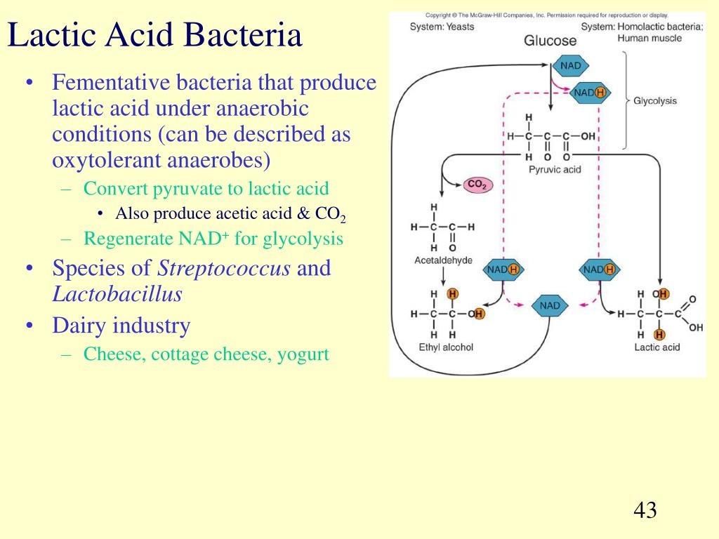 Lactic Acid Bacteria • Fementative bacteria that produce lactic acid under anaerobic conditions (can be described as oxytolerant anaerobes) • Convert pyruvate to lactic acid • Also produce acetic acid & CO2 • Regenerate NAD+ for glycolysis • Species of Streptococcus and Lactobacillus • Dairy industry • Cheese, cottage cheese, yogurt