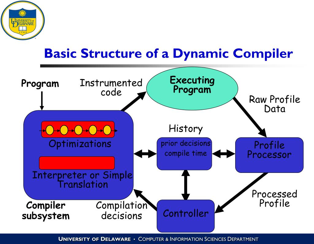 Optimizing Compilers CISC 673 Spring 2009 Dynamic Compilation II. John Cavazos University of Delaware. What is in a Dynamic Compiler?. Interpretation Popular approach for high-level languages Ex, Python, APL, SNOBOL, BCPL, Perl, MATLAB Useful for memory-challenged environments