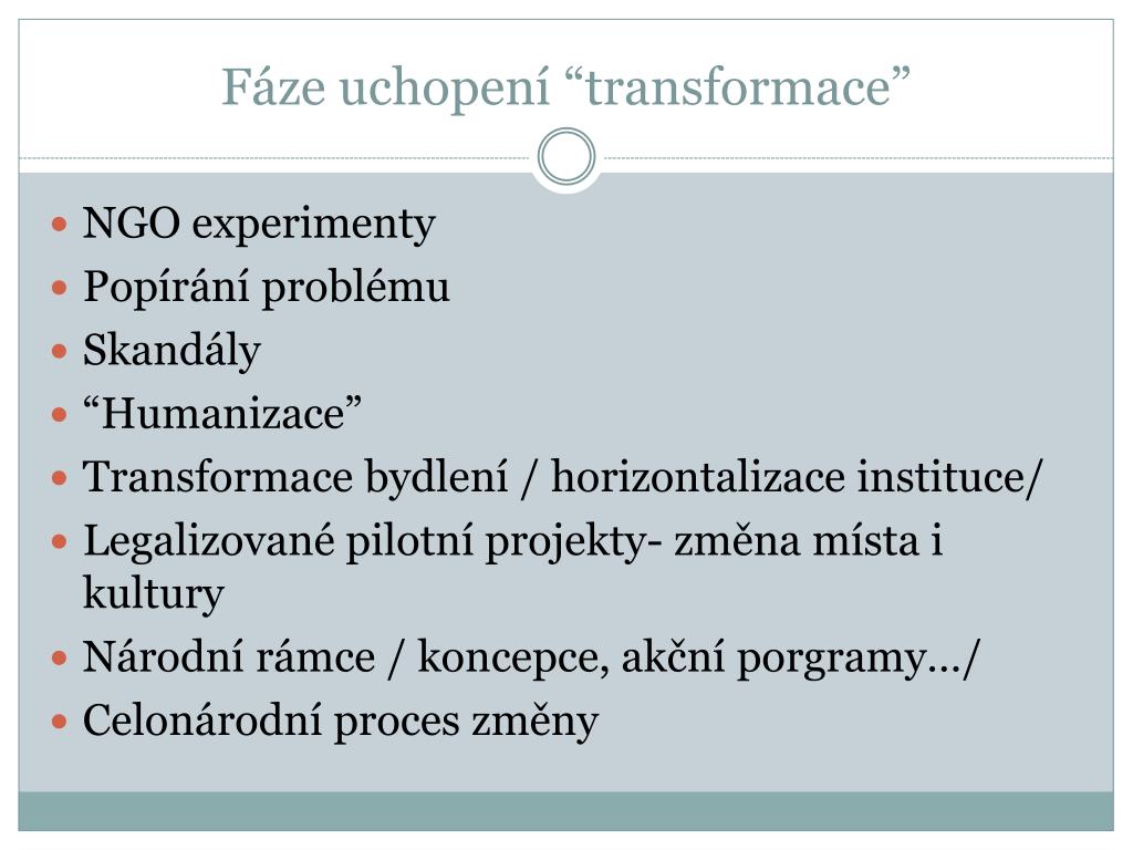 Fázeuchopení “transformace” NGO experimenty Popírání problému Skandály “Humanizace” Transformace bydlení / horizontalizace instituce/ Legalizované pilotní projekty- změna místa i kultury Národní rámce / koncepce, akční porgramy…/ Celonárodní proces změny