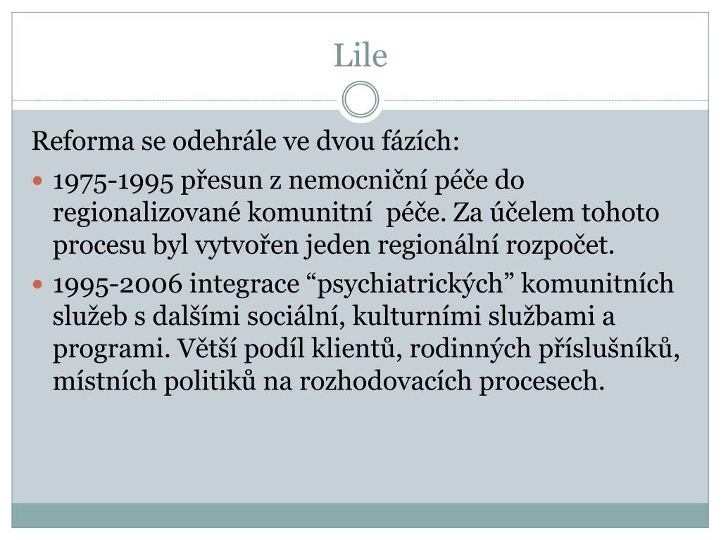 Lile Reforma se odehrále ve dvou fázích: 1975-1995 přesun z nemocniční péče do regionalizované komunitní péče. Za účelem tohoto procesu byl vytvořen jeden regionální rozpočet. 1995-2006 integrace “psychiatrických” komunitních služeb s dalšími sociální, kulturními službami a programi. Větší podíl klientů, rodinných příslušníků, místních politiků na rozhodovacích procesech.