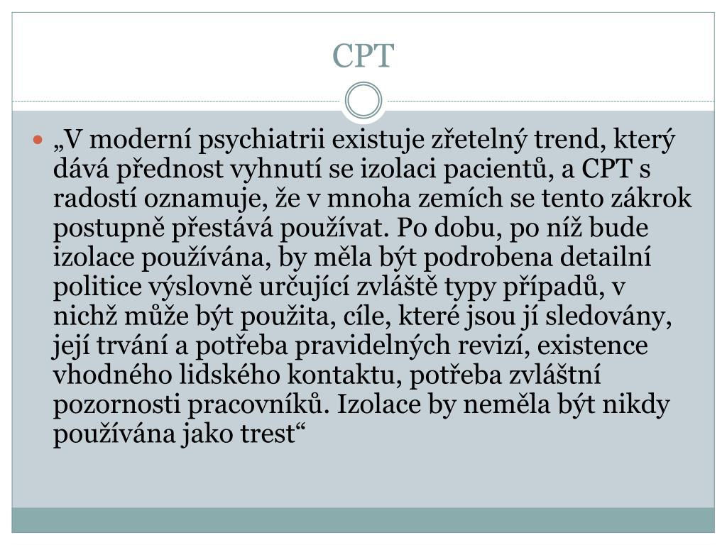 CPT „V moderní psychiatrii existuje zřetelný trend, který dává přednost vyhnutí se izolaci pacientů, a CPT s radostí oznamuje, že v mnoha zemích se tento zákrok postupně přestává používat. Po dobu, po níž bude izolace používána, by měla být podrobena detailní politice výslovně určující zvláště typy případů, v nichž může být použita, cíle, které jsou jí sledovány, její trvání a potřeba pravidelných revizí, existence vhodného lidského kontaktu, potřeba zvláštní pozornosti pracovníků. Izolace by neměla být nikdy používána jako trest“