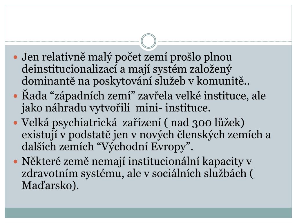 Jen relativně malý počet zemí prošlo plnou deinstitucionalizací a mají systém založený dominantě na poskytování služeb v komunitě.. Řada “západních zemí” zavřela velké instituce, ale jako náhradu vytvořili mini- instituce. Velká psychiatrická zařízení ( nad 300 lůžek) existují v podstatě jen v nových členských zemích a dalších zemích “Východní Evropy”. Některé země nemají institucionální kapacity v zdravotním systému, ale v sociálních službách ( Maďarsko).