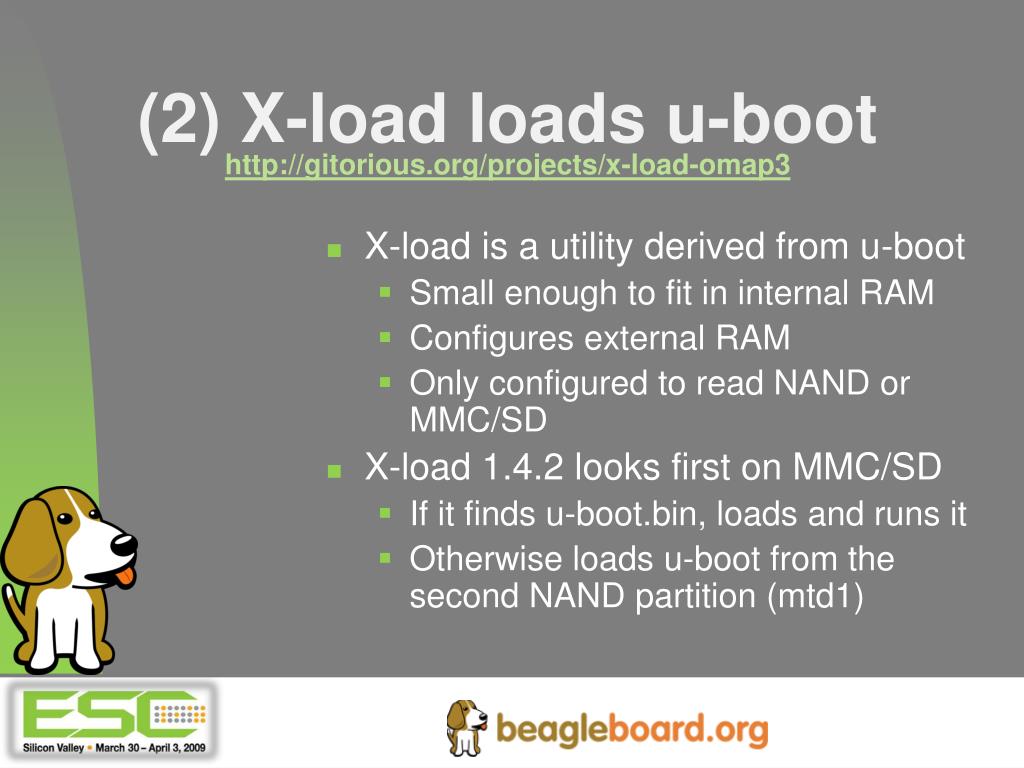 (2) X-load loads u-boothttp://gitorious.org/projects/x-load-omap3 • X-load is a utility derived from u-boot • Small enough to fit in internal RAM • Configures external RAM • Only configured to read NAND or MMC/SD • X-load 1.4.2 looks first on MMC/SD • If it finds u-boot.bin, loads and runs it • Otherwise loads u-boot from the second NAND partition (mtd1)