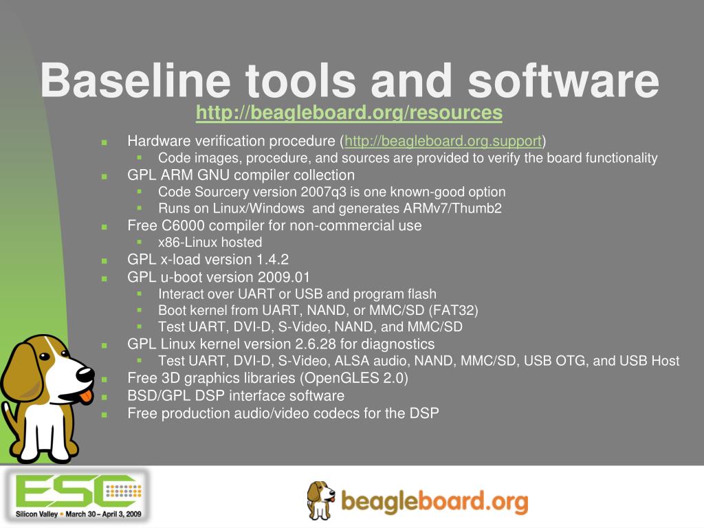 Baseline tools and softwarehttp://beagleboard.org/resources • Hardware verification procedure (http://beagleboard.org.support) • Code images, procedure, and sources are provided to verify the board functionality • GPL ARM GNU compiler collection • Code Sourcery version 2007q3 is one known-good option • Runs on Linux/Windows and generates ARMv7/Thumb2 • Free C6000 compiler for non-commercial use • x86-Linux hosted • GPL x-load version 1.4.2 • GPL u-boot version 2009.01 • Interact over UART or USB and program flash • Boot kernel from UART, NAND, or MMC/SD (FAT32) • Test UART, DVI-D, S-Video, NAND, and MMC/SD • GPL Linux kernel version 2.6.28 for diagnostics • Test UART, DVI-D, S-Video, ALSA audio, NAND, MMC/SD, USB OTG, and USB Host • Free 3D graphics libraries (OpenGLES 2.0) • BSD/GPL DSP interface software • Free production audio/video codecs for the DSP