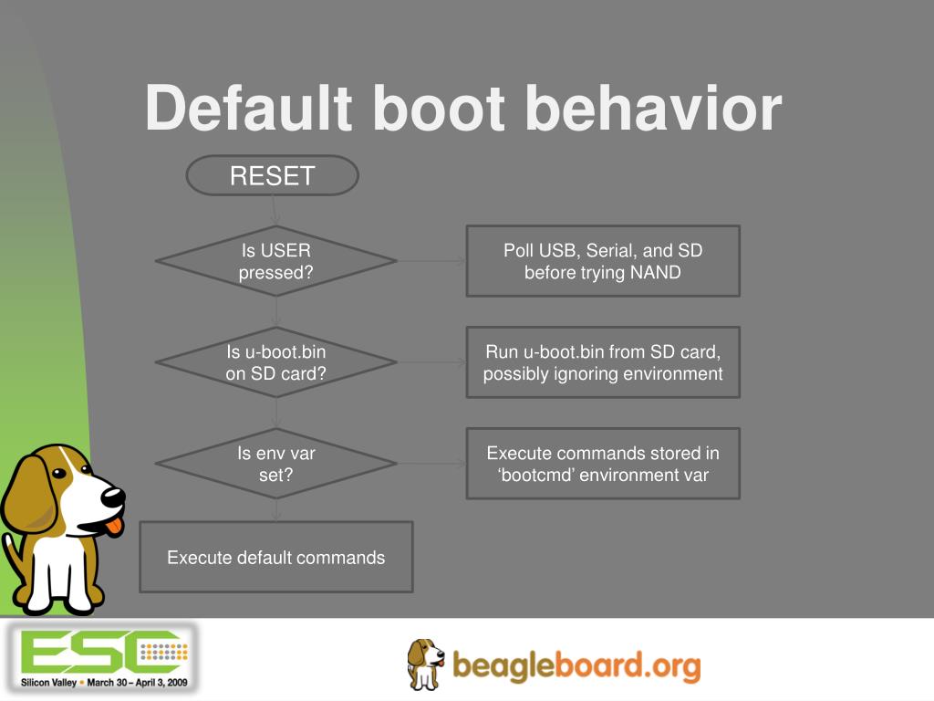 Default boot behavior RESET Is USER pressed? Poll USB, Serial, and SD before trying NAND Is u-boot.bin on SD card? Run u-boot.bin from SD card, possibly ignoring environment Is envvar set? Execute commands stored in ‘bootcmd’ environment var Execute default commands