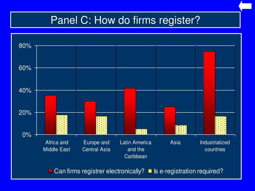 Panel C: The Role of Corporate Registries • What information are firms required to register? • - Is registration compulsory? • - Incorporations/ closings/ re-registrations • - Is annual financial information compulsory? • How do firms register? • What information does the Registrar collect? • - Corporate registrations, Internet domain names, Patents • How is Registrar data distributed? • - Accessibility by creditors, suppliers, lenders and private vendors • (i.e. D&B) • What is the relationship with new and total registrations? • What is the relationship with the business environment?