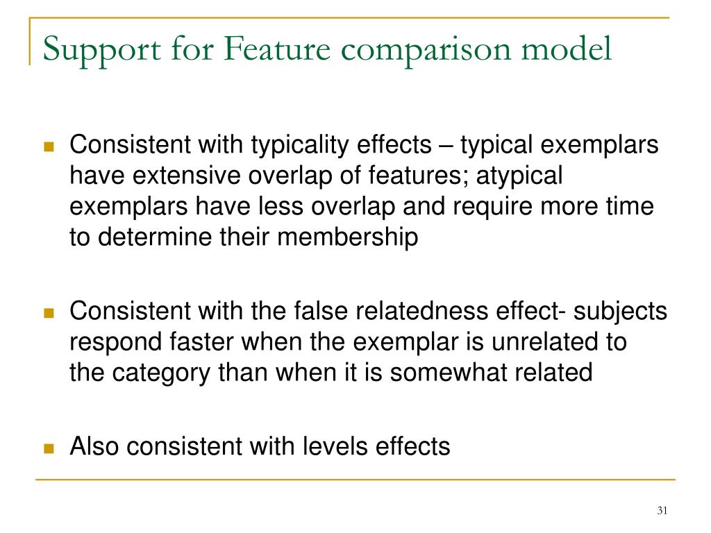 Support for Feature comparison model • Consistent with typicality effects – typical exemplars have extensive overlap of features; atypical exemplars have less overlap and require more time to determine their membership • Consistent with the false relatedness effect- subjects respond faster when the exemplar is unrelated to the category than when it is somewhat related • Also consistent with levels effects