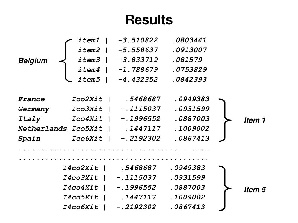 Results item1 | -3.510822 .0803441 item2 | -5.558637 .0913007 item3 | -3.833719 .081579 item4 | -1.788679 .0753829 item5 | -4.432352 .0842393 France Ico2Xit | .2672621 .1360669 Germany Ico3Xit | .4485834 .1301335 Italy Ico4Xit | -.3667433 .1284983 Netherlands Ico5Xit | -.1668095 .1474595 Spain Ico6Xit | .1085338 .122575 France I1co2Xit | .1939196 .1898053 Germany I1co3Xit | -.6497205 .1954673 Italy I1co4Xit | -.3702901 .1787872 Netherlands I1co5Xit | -.2827915 .2075728 Spain I1co6Xit | -.1267169 .169957 Belgium Item 1 Item 2