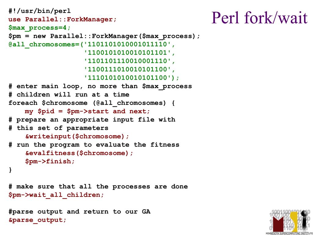 #!/usr/bin/perl use Parallel::ForkManager; $max_process=4; $pm = new Parallel::ForkManager($max_process); @all_chromosomes=('1101101010001011110', '1100101010010101101', '1101101110010001110', '1100111010010101100', '1110101010010101100'); # enter main loop, no more than $max_process # children will run at a time foreach $chromosome (@all_chromosomes) { my $pid = $pm->start and next; # prepare an appropriate input file with # this set of parameters &writeinput($chromosome); # run the program to evaluate the fitness &evalfitness($chromosome); $pm->finish; } # make sure that all the processes are done $pm->wait_all_children; #parse output and return to our GA &parse_output; Perl fork/wait