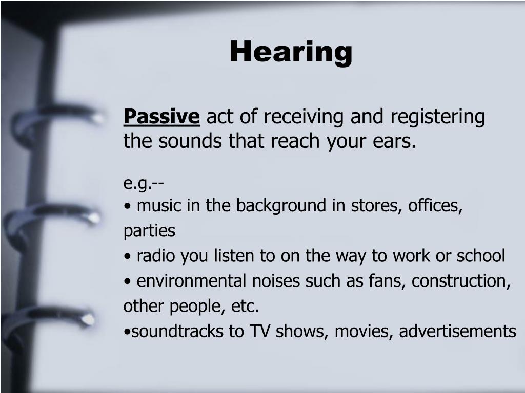 Hearing • Passive act of receiving and registering the sounds that reach your ears. • e.g.-- • music in the background in stores, offices, parties • radio you listen to on the way to work or school • environmental noises such as fans, construction, other people, etc. • soundtracks to TV shows, movies, advertisements