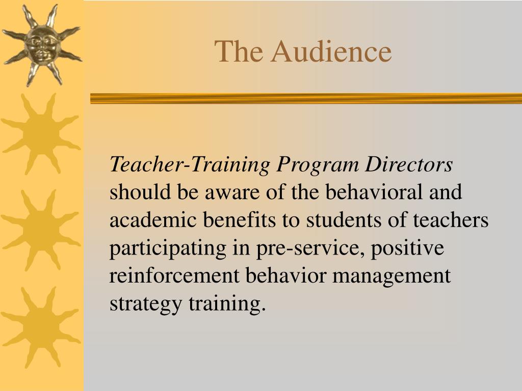The Audience Teacher-Training Program Directors should be aware of the behavioral and academic benefits to students of teachers participating in pre-service, positive reinforcement behavior management strategy training.