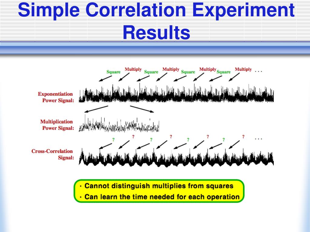 First Attempt: Just Correlation • Ran a simple correlation experiment: correlate power signal from one multiply operation with entire exponentiation’s power signal. • Averaged 5,000 exponentiations with same input value. • Revealed timing but not operation: