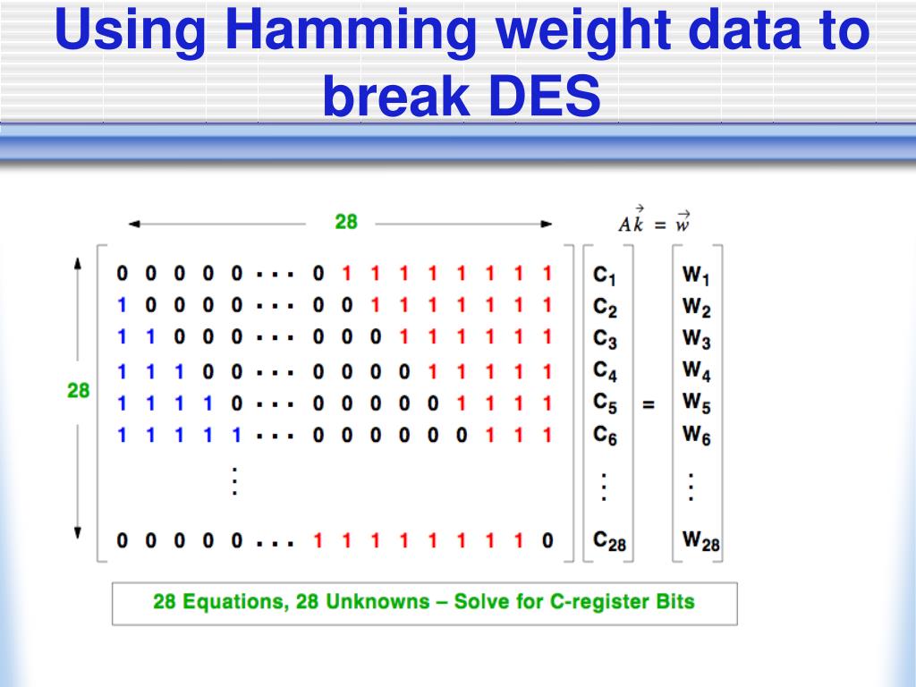Cracking DES w/Hamming Leak • Proposition If attacker knows Hamming weight of each of the kn-bit words of secret key, then brute-force search space is reduced from 2kn to DES example: 256 keys reduced to 240. (n = 8, k = 7).