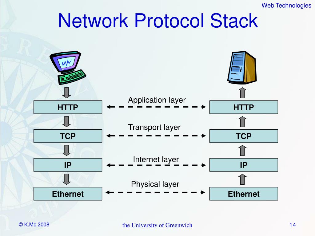 Network Protocol Stack Application layer HTTP HTTP Transport layer TCP TCP Internet layer IP IP Physical layer Ethernet Ethernet the University of Greenwich