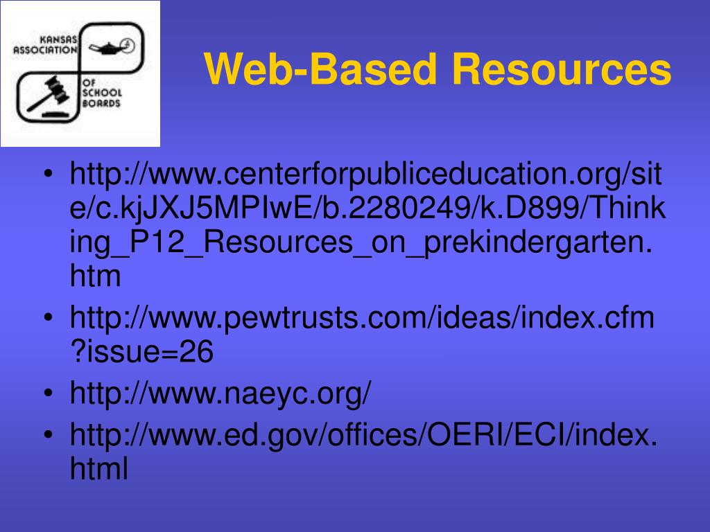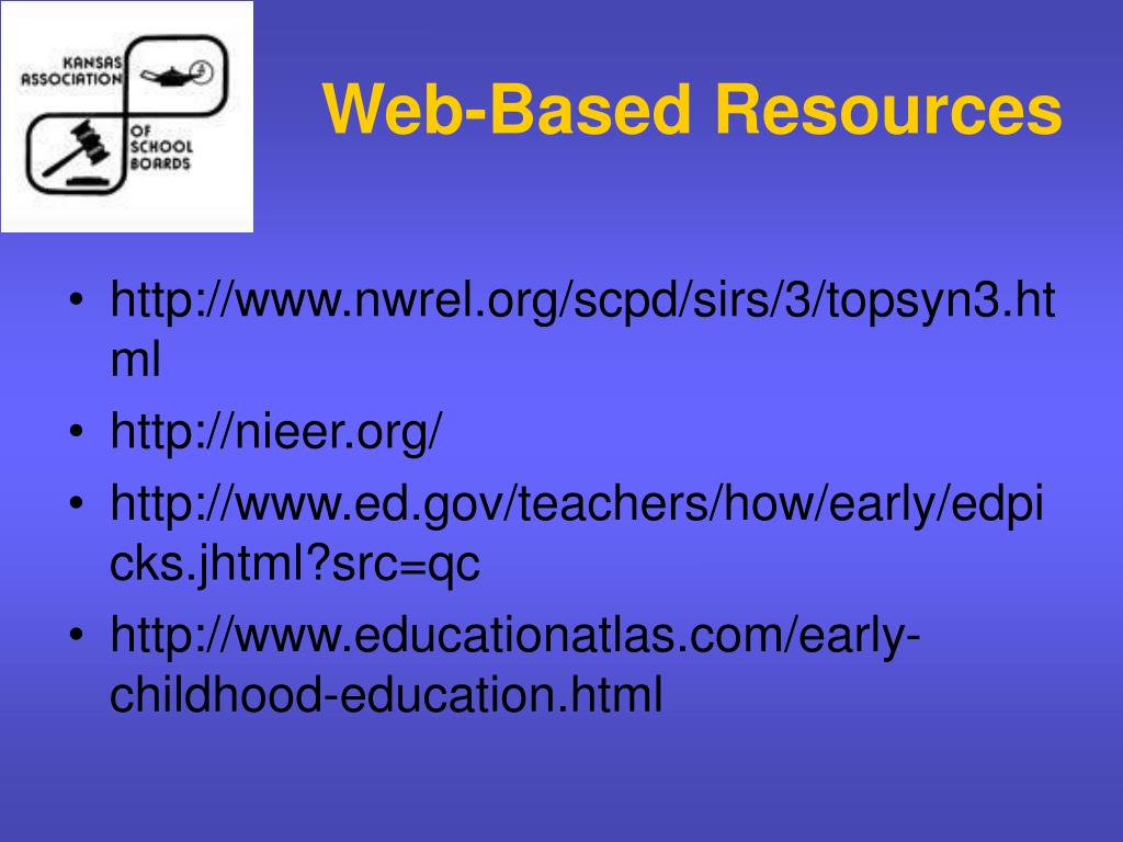 Web-Based Resources • http://www.nwrel.org/scpd/sirs/3/topsyn3.html • http://nieer.org/ • http://www.ed.gov/teachers/how/early/edpicks.jhtml?src=qc • http://www.educationatlas.com/early-childhood-education.html