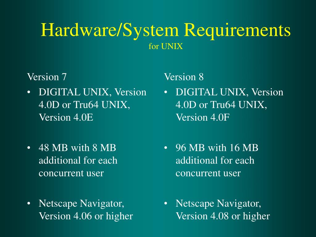 Version 7 DIGITAL UNIX, Version 4.0D or Tru64 UNIX, Version 4.0E 48 MB with 8 MB additional for each concurrent user Netscape Navigator, Version 4.06 or higher Version 8 DIGITAL UNIX, Version 4.0D or Tru64 UNIX, Version 4.0F 96 MB with 16 MB additional for each concurrent user Netscape Navigator, Version 4.08 or higher Hardware/System Requirementsfor UNIX