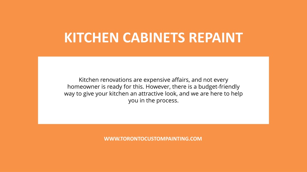 KITCHEN CABINETS REPAINT Kitchen renovations are expensive affairs, and not every homeowner is ready for this. However, there is a budget-friendly way to give your kitchen an attractive look, and we are here to help you in the process. WWW.TORONTOCUSTOMPAINTING.COM