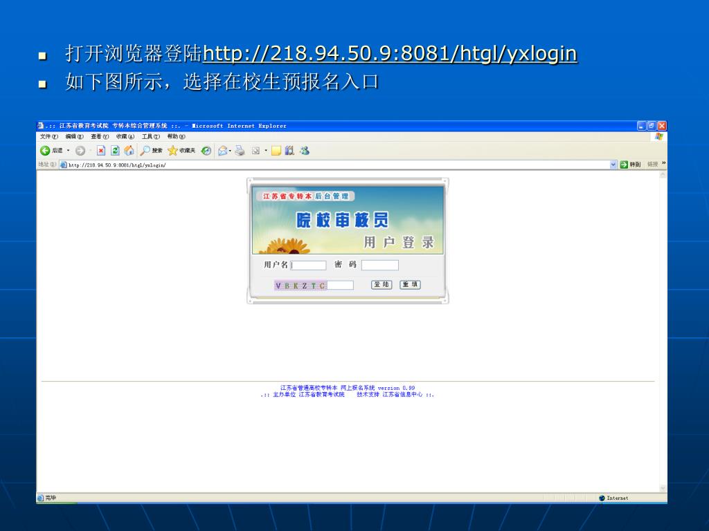打开浏览器登陆http://218.94.50.9:8081/htgl/yxlogin • 如下图所示,选择在校生预报名入口