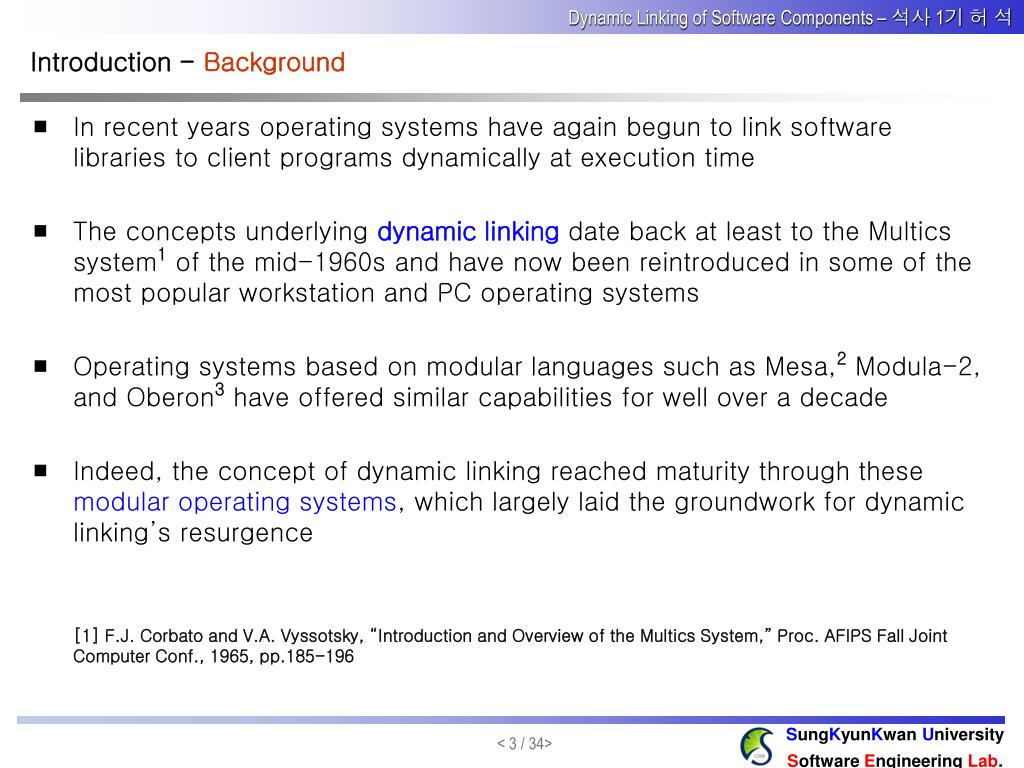 Introduction - Background • In recent years operating systems have again begun to link software libraries to client programs dynamically at execution time • The concepts underlying dynamic linking date back at least to the Multics system1 of the mid-1960s and have now been reintroduced in some of the most popular workstation and PC operating systems • Operating systems based on modular languages such as Mesa,2 Modula-2, and Oberon3 have offered similar capabilities for well over a decade • Indeed, the concept of dynamic linking reached maturity through these modular operating systems, which largely laid the groundwork for dynamic linking’s resurgence [1] F.J. Corbato and V.A. Vyssotsky, “Introduction and Overview of the Multics System,” Proc. AFIPS Fall Joint Computer Conf., 1965, pp.185-196