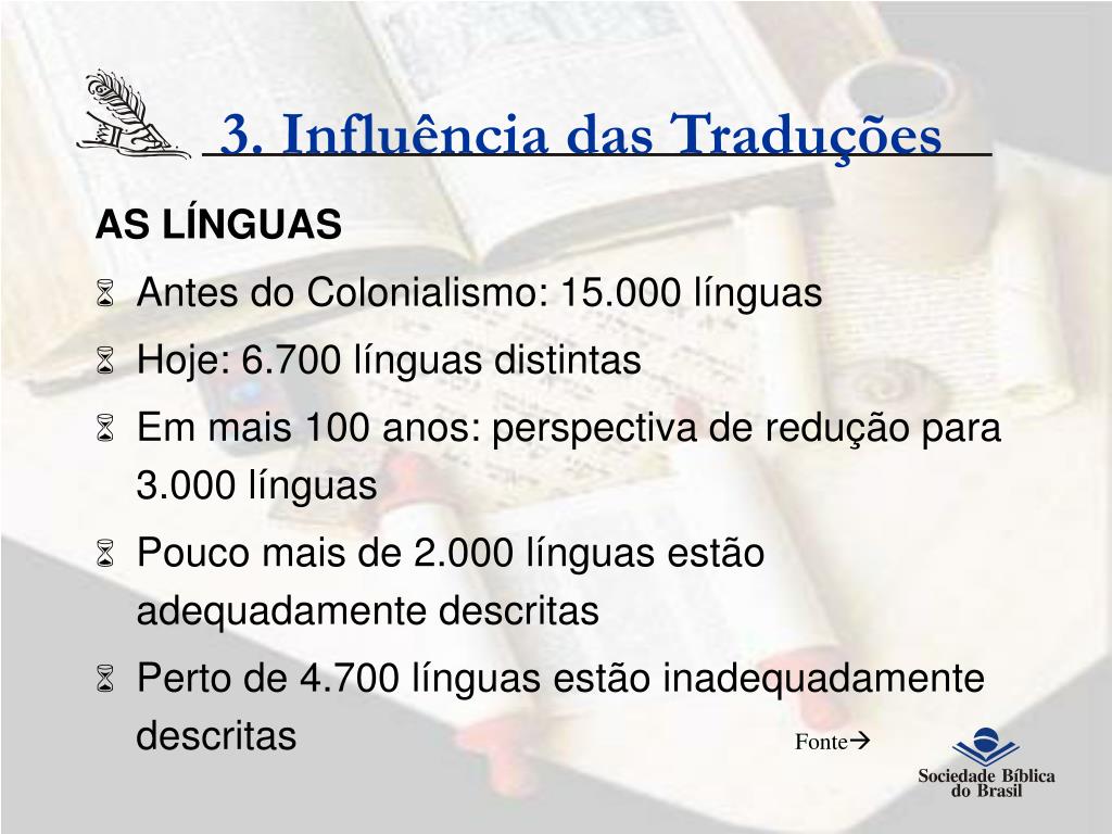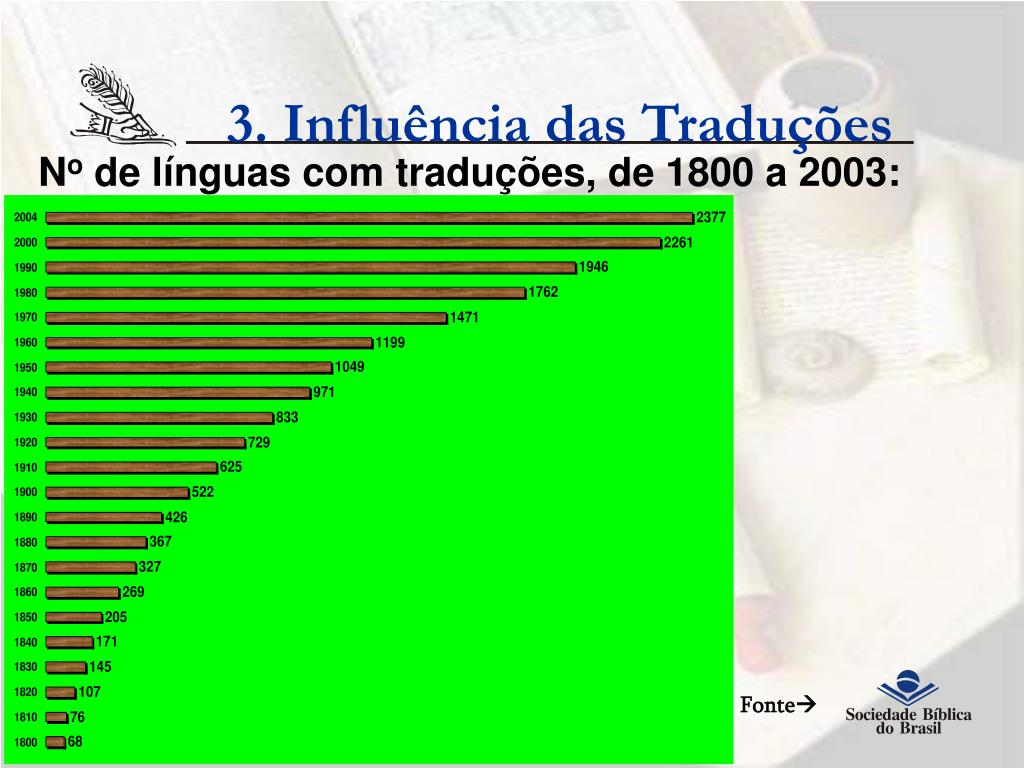 3. Influência das Traduções OBSERVAÇÕES: • 1800: A Bíblia tinha sido traduzida para 68 línguas. • 1804: Inicia o movimento das Sociedades Bíblicas • 1940: A tradução da Bíblia alcançou o número de 1000 línguas. Como celebração foi escrito o livro: The Book of a Thousand Tongues • 2004: A Bíblia está traduzida para 2377 línguas • Levou 1900 anos para traduzir a Bíblia para 1000 línguas e apenas 64 anos para traduzi-la para mais 1377 línguas Fonte