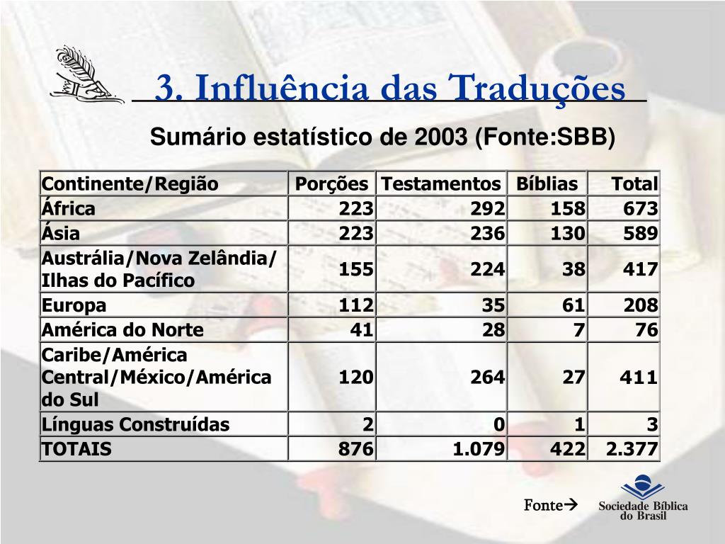 3. Influência das Traduções Sumário estatístico de 2003 (Fonte:SBB) Fonte