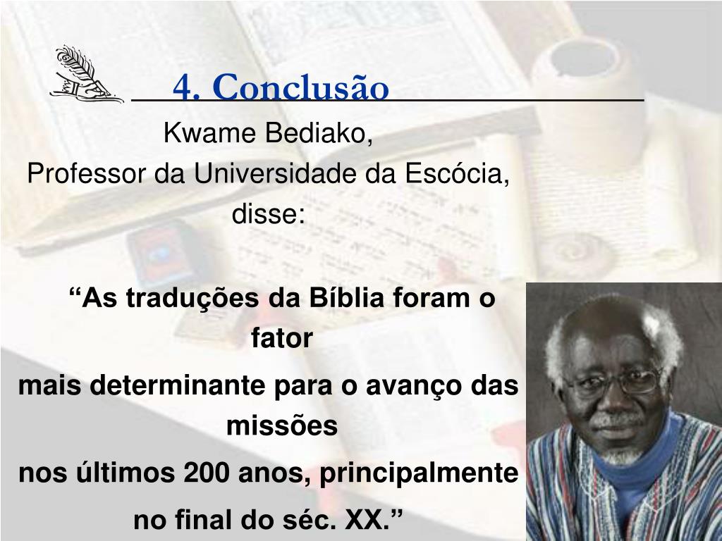 4. Conclusão Kwame Bediako, Professor da Universidade da Escócia, disse: “As traduções da Bíblia foram o fator mais determinante para o avanço das missões nos últimos 200 anos, principalmente no final do séc. XX.”