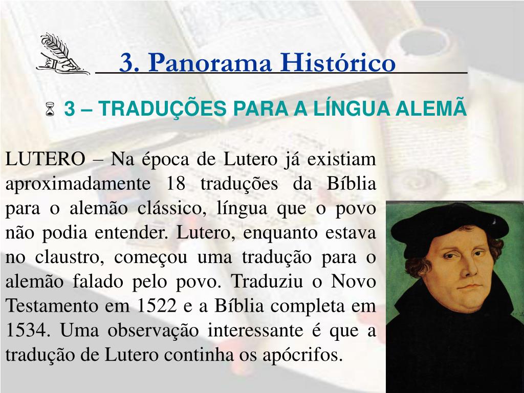 3. Panorama Histórico • 3 – TRADUÇÕES PARA A LÍNGUA ALEMÃ LUTERO – Na época de Lutero já existiam aproximadamente 18 traduções da Bíblia para o alemão clássico, língua que o povo não podia entender. Lutero, enquanto estava no claustro, começou uma tradução para o alemão falado pelo povo. Traduziu o Novo Testamento em 1522 e a Bíblia completa em 1534. Uma observação interessante é que a tradução de Lutero continha os apócrifos.