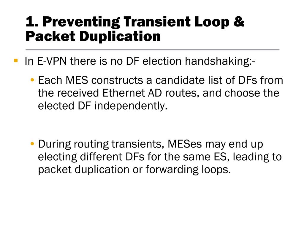 1. Preventing Transient Loop & Packet Duplication • In E-VPN there is no DF election handshaking:- • Each MES constructs a candidate list of DFs from the received Ethernet AD routes, and choose the elected DF independently. • During routing transients, MESes may end up electing different DFs for the same ES, leading to packet duplication or forwarding loops.