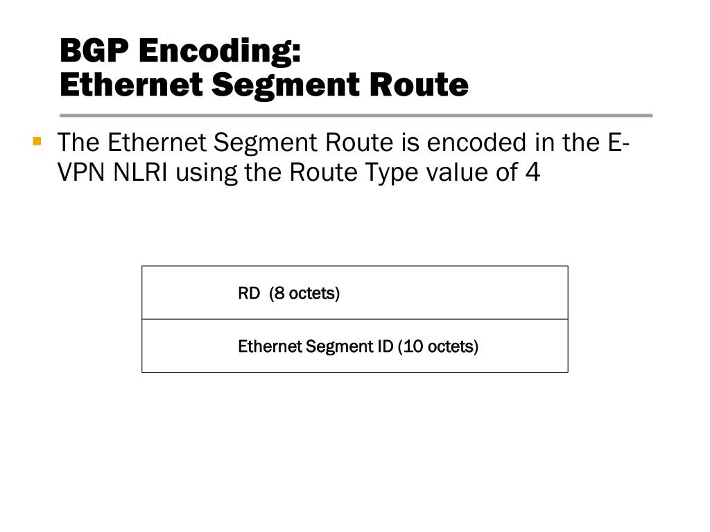 BGP Encoding: Ethernet Segment Route • The Ethernet Segment Route is encoded in the E-VPNNLRI using the Route Type value of 4 RD (8 octets) Ethernet Segment ID (10 octets)