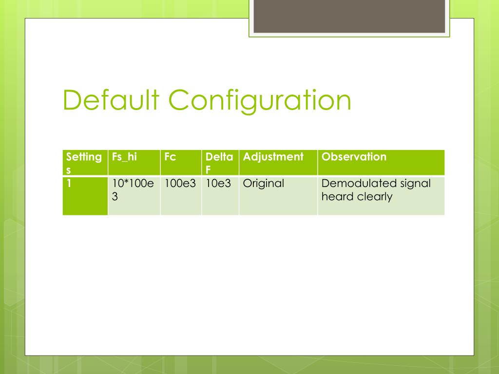 Conclusion • In summary, we used the radio and played around with the parameters, Fs_Hi and DeltaF and compared the result (demodulated signal) with the original signal. • Apparently, an increase in Fs_Hi will amplify the arbitrary noise that appeared due to the approximation process of the differentiation. • A lower Fs_Hi will decrease the noise in the demodulated signal. An increase in DeltaF will decrease the noise significantly and a decrease in DeltaF results in an increase in noise and destruction of the original signal (i.e., when the demodulated signal is played, the original message cannot be heard).