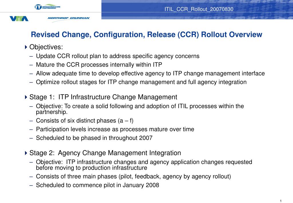 ITIL Change, Configuration, Release Processes Staged Roll Out Plan. Revised Change, Configuration, Release (CCR) Rollout Overview. Objectives: Update CCR rollout plan to address specific agency concerns Mature the CCR processes internally within ITP