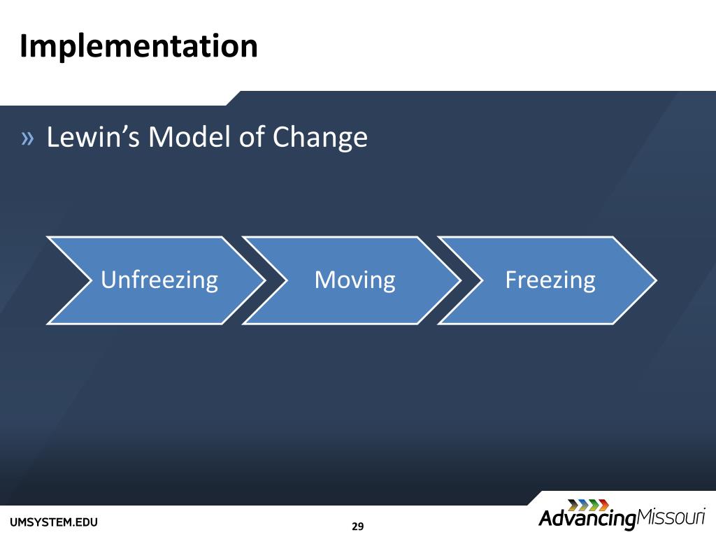 Moving • Act of implementing new behaviors, method, policies, etc. to support the new way of doing things • New policies went into affect for everyone • Rolled out the new electronic system to divisions over a 6-month period • Multiple training tools and communications were made available
