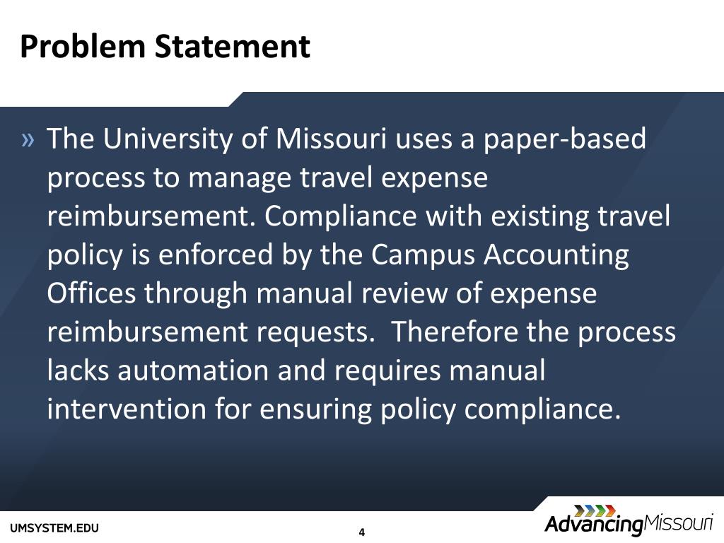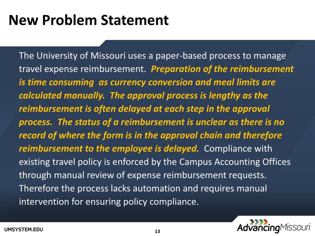 New Problem Statement The University of Missouri uses a paper-based process to manage travel expense reimbursement. Preparation of the reimbursement is time consuming as currency conversion and meal limits are calculated manually. The approval process is lengthy as the reimbursement is often delayed at each step in the approval process. The status of a reimbursement is unclear as there is no record of where the form is in the approval chain and therefore reimbursement to the employee is delayed. Compliance with existing travel policy is enforced by the Campus Accounting Offices through manual review of expense reimbursement requests. Therefore the process lacks automation and requires manual intervention for ensuring policy compliance.