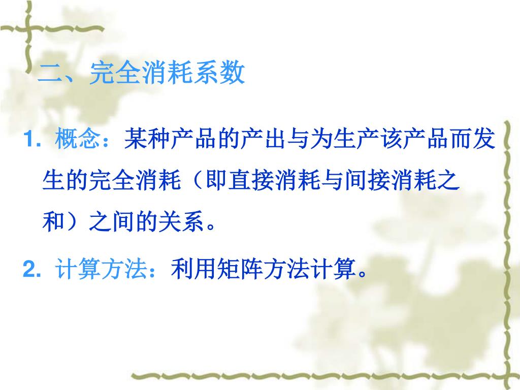 二、完全消耗系数 1. 概念:某种产品的产出与为生产该产品而发生的完全消耗(即直接消耗与间接消耗之和)之间的关系。 2. 计算方法:利用矩阵方法计算。