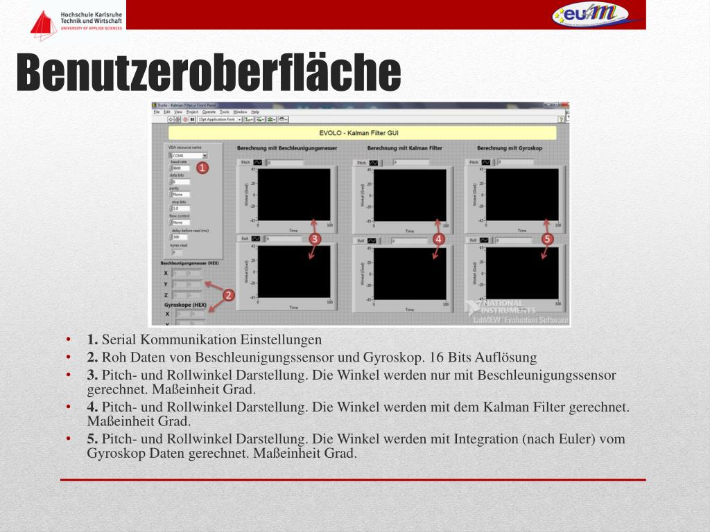 1. Serial Kommunikation Einstellungen • 2. Roh Daten von Beschleunigungssensor und Gyroskop. 16 Bits Auflösung • 3. Pitch- und Rollwinkel Darstellung. Die Winkel werden nur mit Beschleunigungssensor gerechnet. Maßeinheit Grad. • 4. Pitch- und Rollwinkel Darstellung. Die Winkel werden mit dem Kalman Filter gerechnet. Maßeinheit Grad. • 5. Pitch- und Rollwinkel Darstellung. Die Winkel werden mit Integration (nach Euler) vom Gyroskop Daten gerechnet. Maßeinheit Grad. Benutzeroberfläche