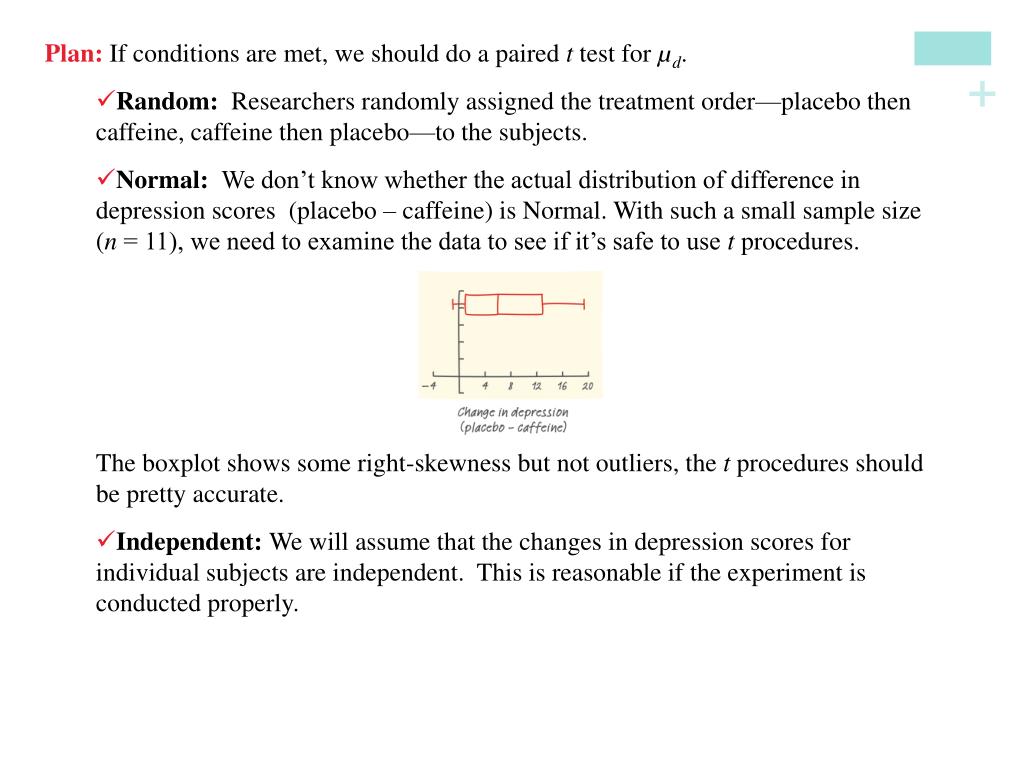Plan: If conditions are met, we should do a paired t test for µd. • Random:Researchers randomly assigned the treatment order—placebo then caffeine, caffeine then placebo—to the subjects. • Normal: We don’t know whether the actual distribution of difference in depression scores (placebo – caffeine) is Normal. With such a small sample size (n = 11), we need to examine the data to see if it’s safe to use t procedures. • The boxplot shows some right-skewness but not outliers, the t procedures should be pretty accurate. • Independent: We will assume that the changes in depression scores for individual subjects are independent. This is reasonable if the experiment is conducted properly.