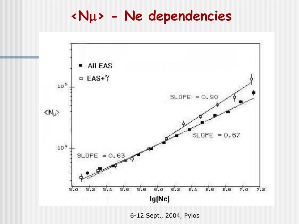 Dependencies <Nm>-Ne are compared for two groups of EAS: -All EAS (~400 000) -EAS withg-families (~1700)-one EC (~6400)-two EC (2004) • Selection criteria: -EAS in circleR 20 m, with zenith angles q 30° -g-families at EC: еEg 10 TeV, Ng 1 (Ng = 1 ~70%) 6-12 Sept., 2004, Pylos