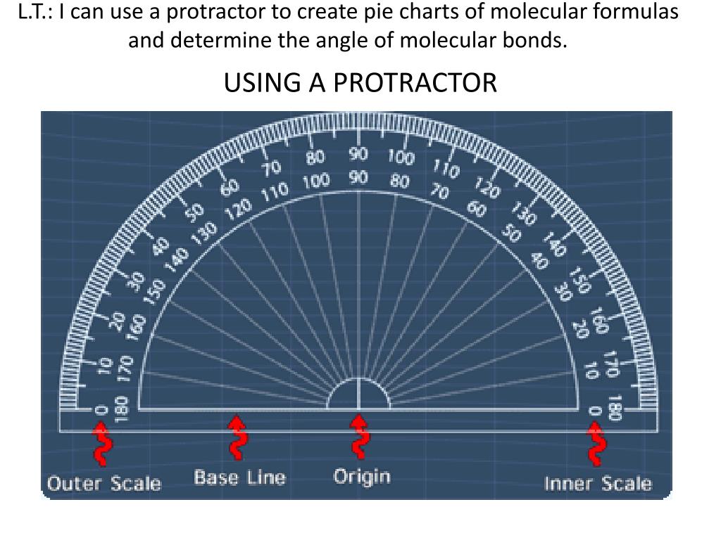 L.T.: I can use a protractor to create pie charts of molecular formulas and determine the angle of molecular bonds. YOUR TASK: Complete the worksheet. ****Use the protractor to create the pie chart