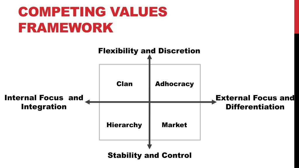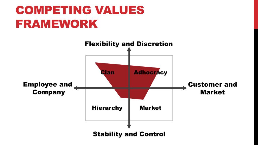 Competing Values Framework Flexibility and Discretion Employee and Company Customer and Market Clan Adhocracy Hierarchy Market Stability and Control