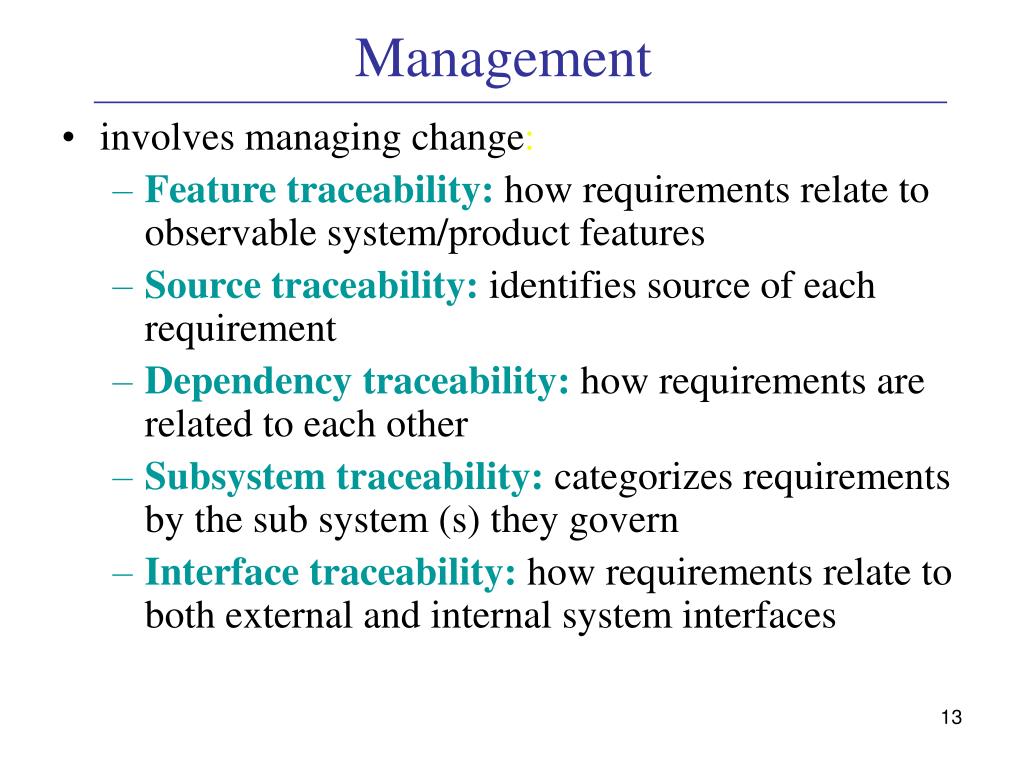 Management • involves managing change: • Feature traceability: how requirements relate to observable system/product features • Source traceability: identifies source of each requirement • Dependency traceability: how requirements are related to each other • Subsystem traceability: categorizes requirements by the sub system (s) they govern • Interface traceability: how requirements relate to both external and internal system interfaces