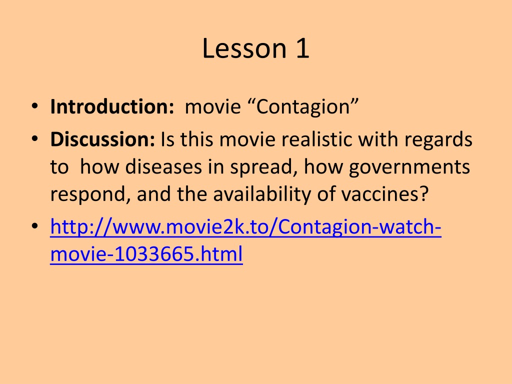 Lesson 1 • Introduction: movie “Contagion” • Discussion: Is this movie realistic with regards to how diseases in spread, how governments respond, and the availability of vaccines? • http://www.movie2k.to/Contagion-watch-movie-1033665.html